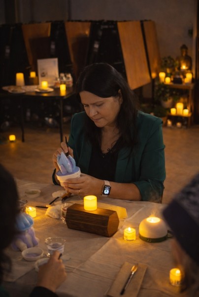 Then they paint. Each participant receives a hand-selected ceramic piece and is guided through a structured creative meditation experience. No art background needed. No performance required. Just presence.